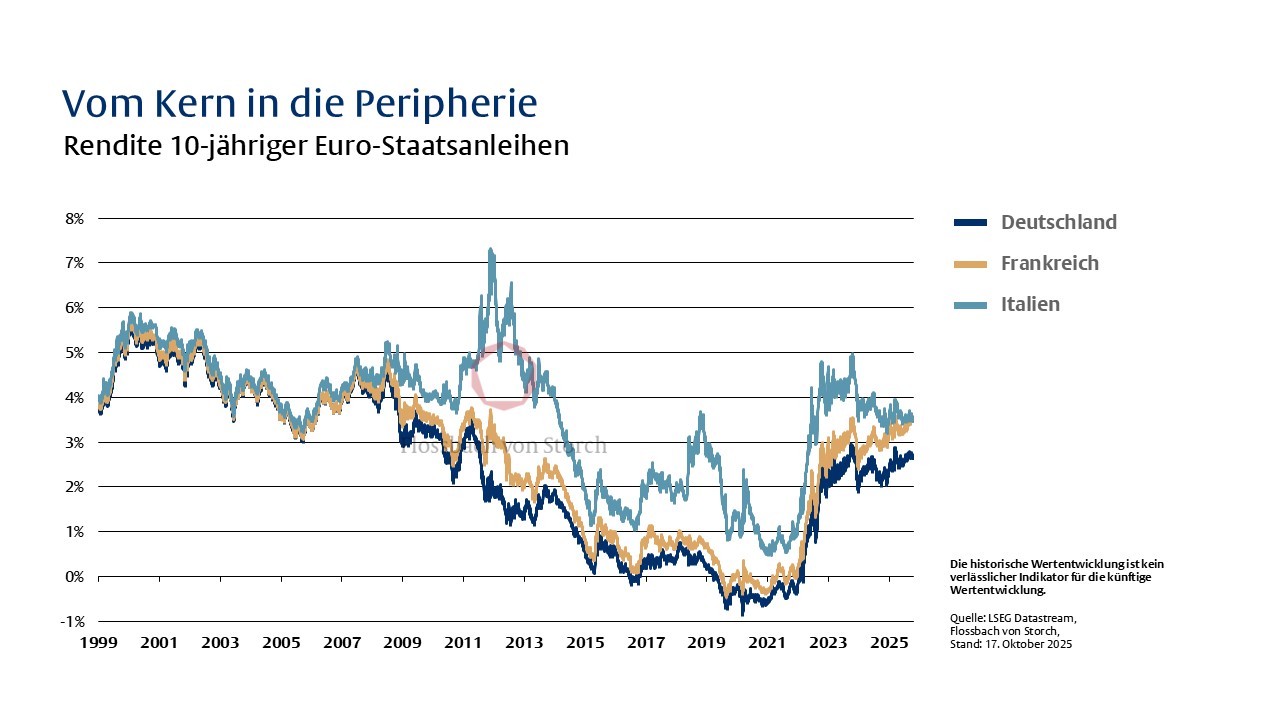 Am 9. September 2025, um 08:54 Uhr, ereignete sich Historisches in der Geschichte der Eurozone. Kurz vor Beginn des Börsenhandels auf dem europäischen Festland notierten zehnjährige französische Staatsanleihen bei einer Rendite von 3,48 Prozent und damit marginal höher als ihre italienischen Pendants. Seit Einführung der Gemeinschaftswährung 1999 ist es noch nie vorgekommen, dass der französische Staat höhere Zinsen an seine Gläubiger zahlen musste als der italienische. Wie konnte es so weit kommen, dass das Kernland Frankreich renditeseitig einen ehemaligen Vertreter der Euro-Peripherie überholt?