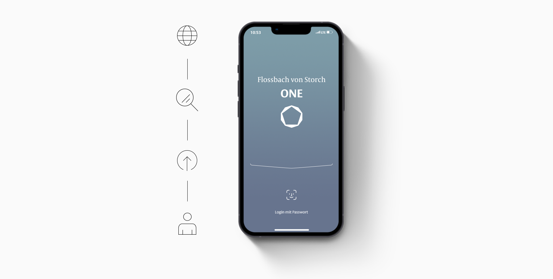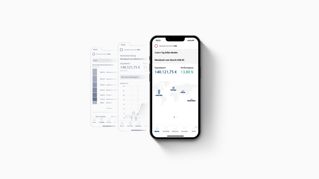 Nach einem vollständig papierlosen Onboardingprozess bietet Ihnen Flossbach von Storch ONE per App und Browser zu jeder Zeit und von jedem Ort Zugriff auf Ihre Vermögensverwaltung.